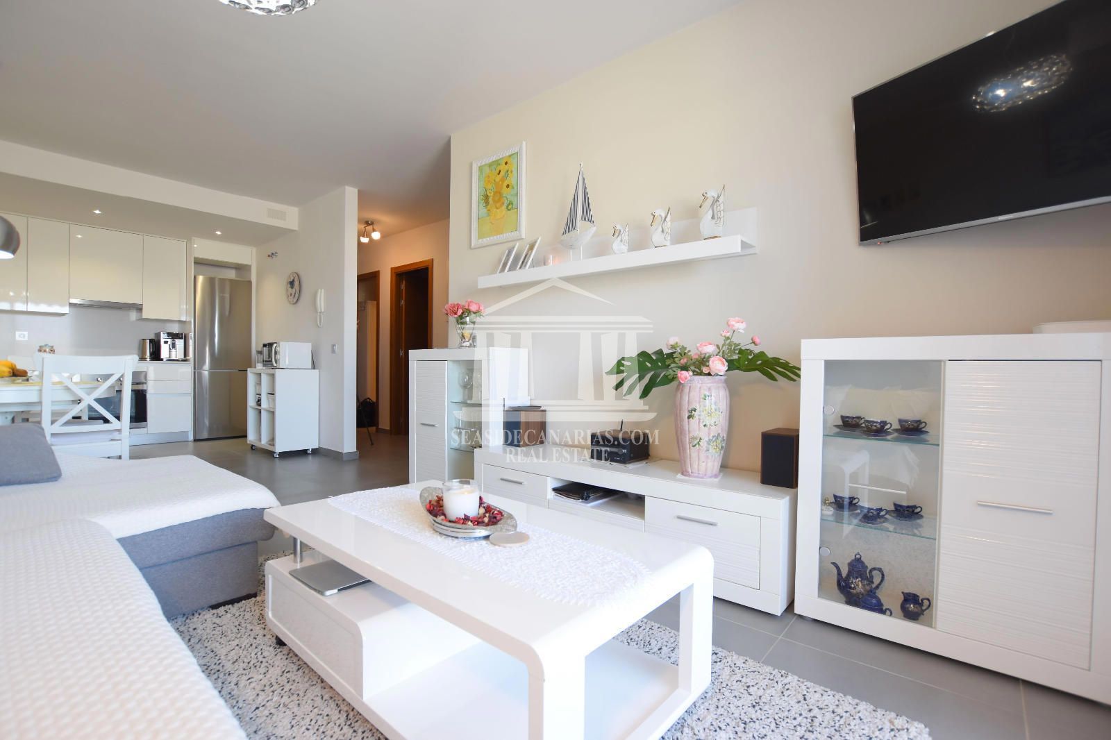 El complejo residencial, construido en 2018 y de diseño moderno, incluye piscina climatizada comunitaria, jardines cuidados, zonas de garaje en sótano, ascensores y un mantenimiento de alta calidad. Este ático dúplex ofrece una distribución versátil y espaciosa, con un total de 118 m² construidos distribuidos en dos plantas. La planta baja cuenta con salón-comedor luminoso con salida directa a una terraza privada de 15 m² (perfecta para comidas al aire libre o relax diario), cocina americana completamente equipada y funcional, baño completo y espacio para lavadora. La planta alta, donde se encuentra la gran terraza, mide unos 42m2. Las dos terrazas exteriores, con orientación noroeste, son el gran atractivo: amplias, soleadas y con vistas privilegiadas para disfrutar de los espectaculares atardeceres canarios y la brisa del mar. La propiedad se encuentra en excelente estado, lista para entrar a vivir inmediatamente, y se vende completamente amueblada y equipada (con todos los muebles, electrodomésticos y enseres necesarios incluidos). Cuenta con licencia de Vivienda Vacacional (VV) vigente, pero nunca se ha alquilado.