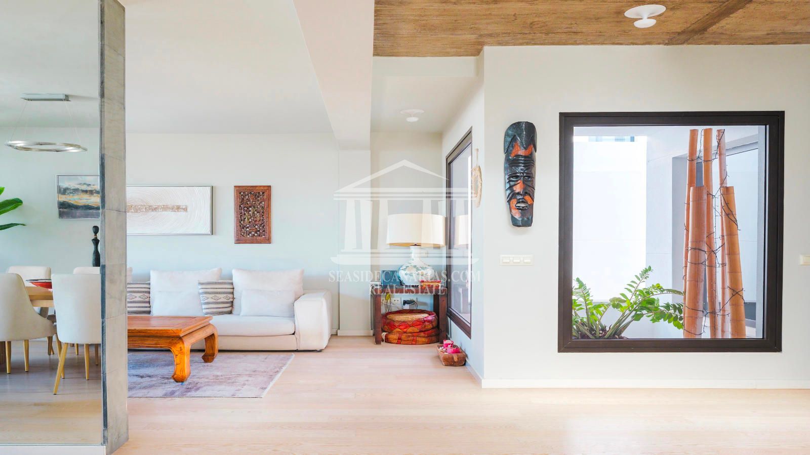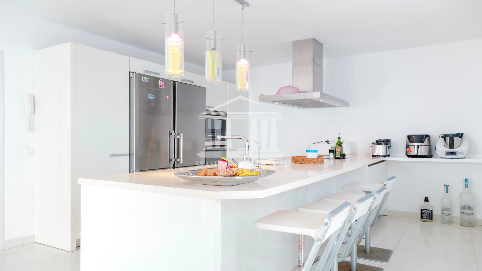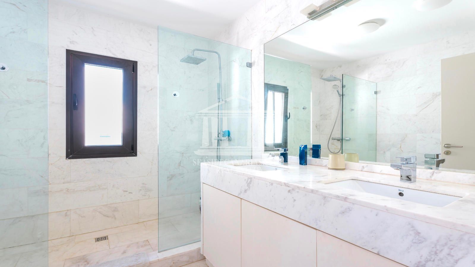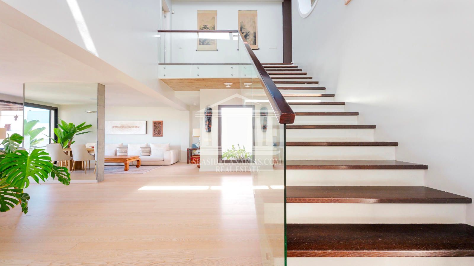 • Основной этаж: Частный пандус ведет к главному входу, параллельно въезду в гараж. Внутри — просторная гостиная с видом на море, зона отдыха и телевидения, кабинет, гостевой туалет и отдельная полностью оборудованная кухня с выходом на большую террасу и патио, идеально подходящие для обедов на свежем воздухе.